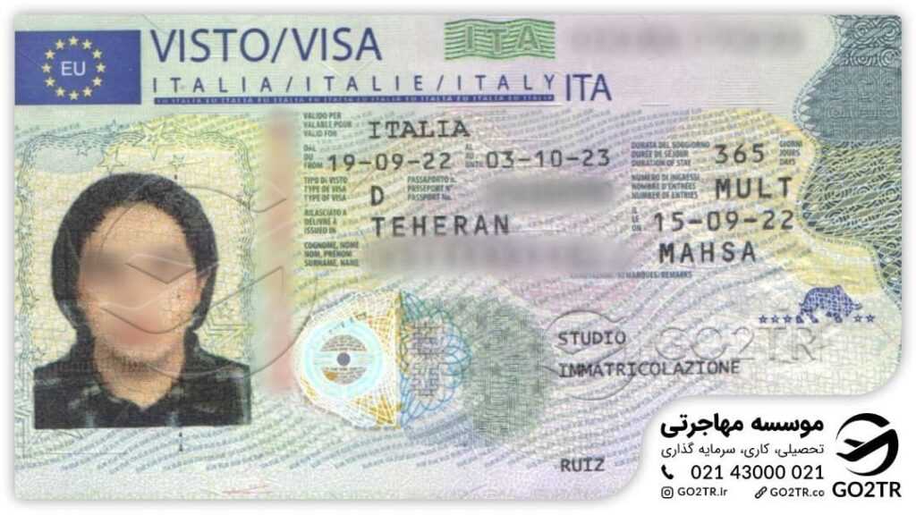 باتوجه به اینکه ایتالیا جزو کشورهای اتحادیه اروپا و شینگن است، شما برای تحصیل در این کشور میتوانید ویزای تایپ D را که تا زمان اتمام دوره تحصیلی اعتبار دارد را دریافت کنید. پس از ورود به ایتالیا باید حداکثر تا ۸ روز ورود خود را به ایستگاه Questura گزارش دهید تا بتوانید کارت اقامت دریافت کنید.