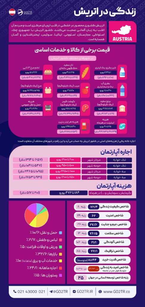 موقعیت مکانی نیز میتواند تأثیر قابل توجهی بر سطح درآمد در اتریش داشته باشد. بهطور کلی، شههاری بزرگی مانند وین، سالزبورگ و گراتس تمایل به ارائه دستمزدهای بالاتر در مقایسه با مناطق روستایی یا کمتر توسعه یافته اقتصادی اتریشی دارند. GO2TR در جدول زیر میانگین درآمد در ۴ شهر بزرگ اتریش را به شما نشان خواهد داد.
