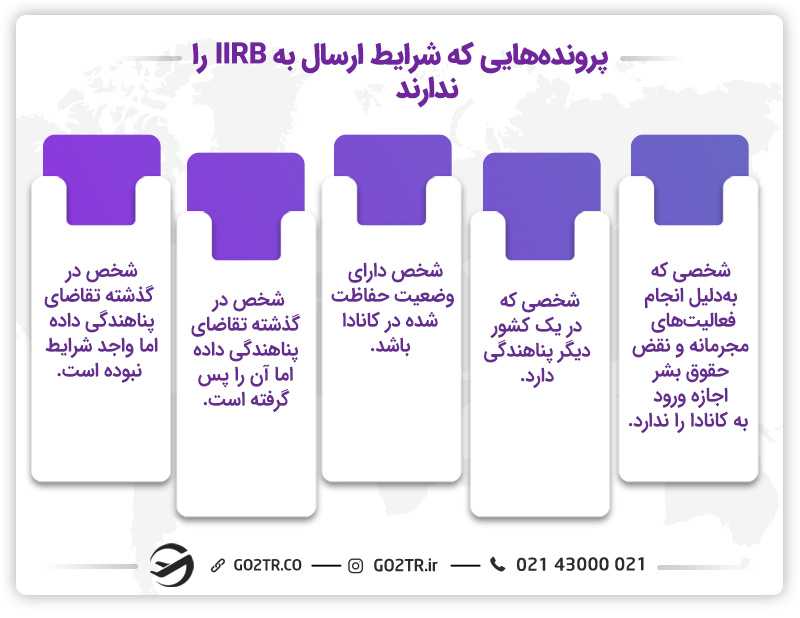 بسیاری از پروندهها، شرایط ارجاع به IRB را ندارند. بهعنوانمثال؛ هنگامیکه پناهجو از طریق مرز ایالاتمتحده وارد کانادا شده باشد، پرونده وی به IRB ارجاع داده نخواهد شد. چراکه کانادا در سال ۲۰۰۴ میلادی توافقنامهای با ایالاتمتحده امضا کرد. بر اساس این توافقنامه، افرادی که میخواهند درخواست پناهندگی دهند، باید بهمحض ورود به اولین کشور امن درخواست خود را ارائه دهند. بنابراین اگر پناهجو از مرزهای آمریکا وارد کانادا شود، ادعای پناهندگی او پذیرفته نخواهد شد. مگر در شرایط استثنایی مثل وقتیکه خانواده پناهجو در کانادا باشند. جالب است بدانید که سالانه افراد زیادی در راه مهاجرت غیرقانونی جان خود را از دست میدهند. درحالیکه میتوانستند بهسادگی و با انتخاب یکی از روشهای مهاجرت قانونی به اهداف خود دست پیدا کنند.