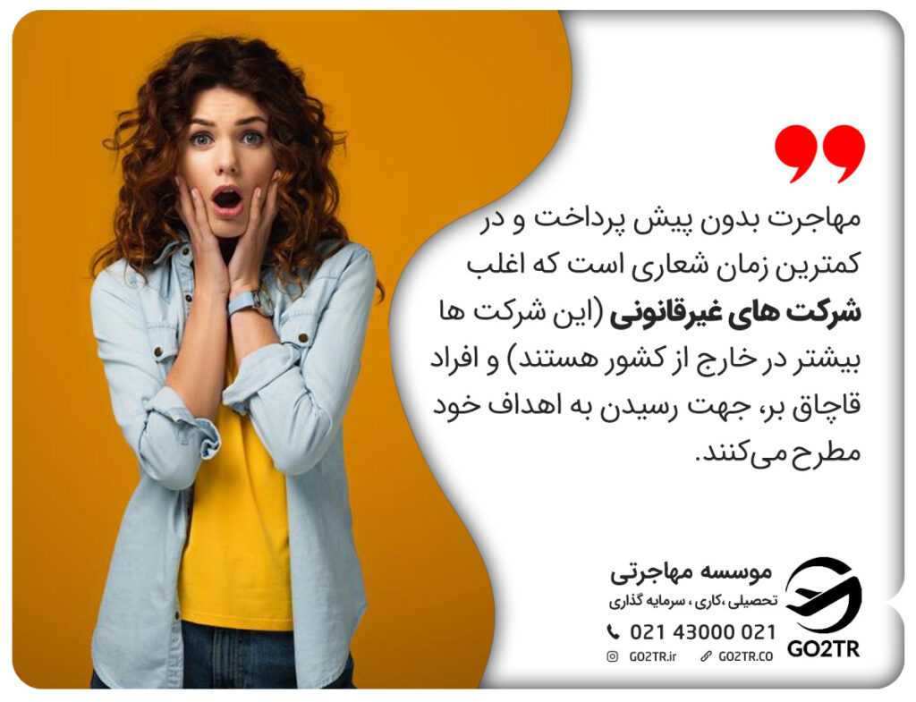 متاسفانه امروزه در فضاهای مجازی شاهد تبلیغات شرکت های غیرقانونی هستیم. که ادعا می کنند مهاجران را بدون پیش پرداخت به مقصد مورد نظر می رسانند! آنها در مقابل از افراد هزینه های کلانی را دریافت می کنند. افراد در قبال پرداخت این هزینه ها در کشور مقصد هیچگونه حق قانونی ندارند. همچنین آنها در بیشتر مواقع در کشور مقصد دستگیر شده و به کشور مبدا بازگردانده می شوند. چه بسا بهتر است که آنها همین هزینه را در راه صحیح مهاجرت مصرف کنند و آینده ی خود و عزیزانشان را به خطر نیاندازند.