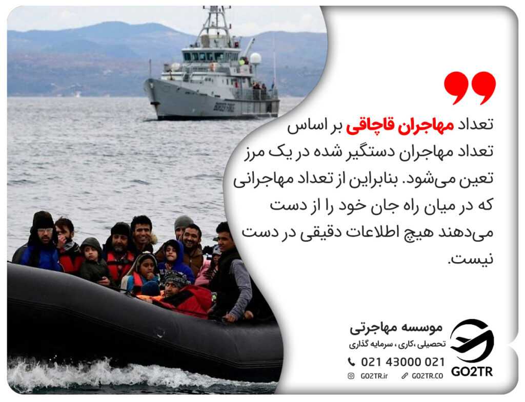 هیچ گزارش جهانی سالانه در مورد روند قاچاق مهاجران در دست نیست. آمارهای رسمی در مورد قاچاق مهاجران محدود است. زیرا بسیاری از کشورها چنین دادههایی را جمعآوری یا منتشر نمیکنند. تعداد مهاجران قاچاقی بر اساس تعداد مهاجران دستگیر شده در یک مرز تعین میشود. بنابراین از تعداد مهاجرانی که در میان راه جان خود را از دست میدهند هیچ اطلاعات دقیقی در دست نیست.
