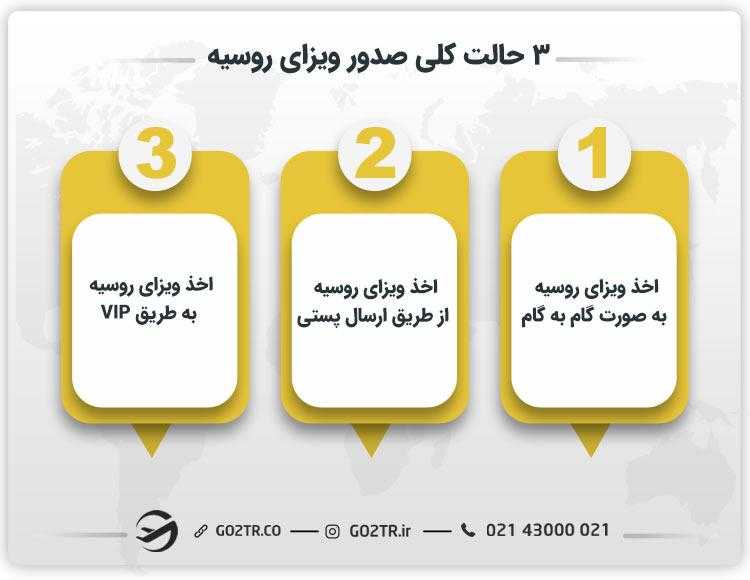 مرکز رسمی ویزای روسیه در ایران تنها موسسه موردتایید سفارت روسیه در جمهوری اسلامی ایران برای پذیرش مدارک موردنیاز دریافت ویزای روسیه است. صدور ویزای روسیه از این شرکت در ۳ حالت کلی زیر است: