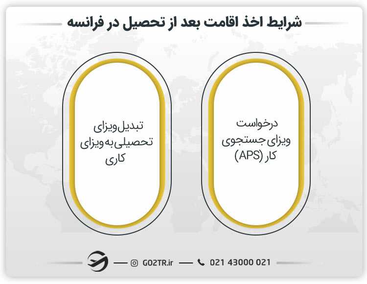 - درخواست ویزای جستجوی کار (APS): بعد از پایان تحصیلات کارشناسی ارشد یا بالاتر در فرانسه، شما میتوانید برای ویزای جستجوی کار یا راهاندازی کسبوکار (APS) درخواست دهید. این ویزا به مدت ۱۲ ماه اعتبار دارد و به شما اجازه میدهد در این مدت در فرانسه به دنبال کار مرتبط با رشته تحصیلیتان بگردید یا کسبوکار خود را راهاندازی کنید. همچنین در این مدت میتوانید تا ۶۰ درصد ساعات کاری تماموقت را به صورت قانونی کار کنید.
