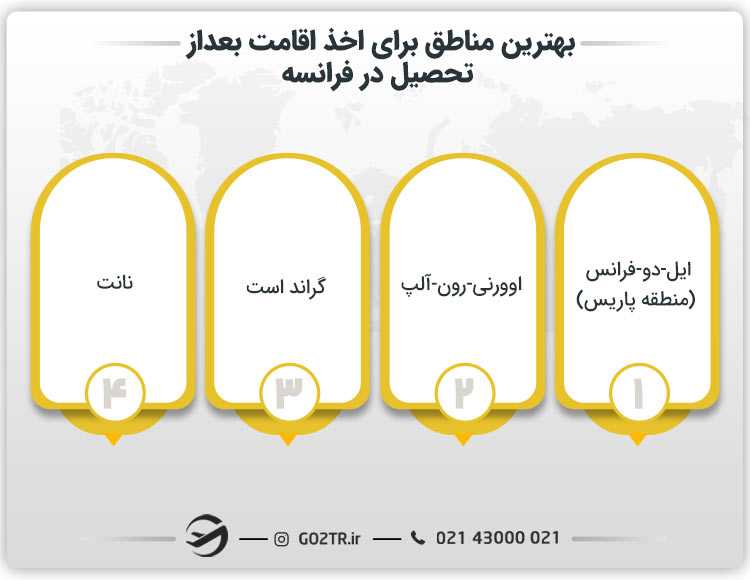 بهترین مناطق برای دریافت اقامت بعد از تحصیل در فرانسه شامل پاریس، لیون، تولوز، نانت و گرنوبل هستند که فرصتهای شغلی و کیفیت زندگی بالایی دارند.