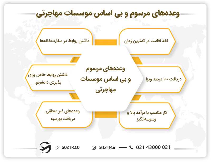 تبلیغات اغوا کننده زیادی مبنی بر بورسهای تحصیلی در بهترین دانشگاهها، مجوز کار برای مشاغلی با درآمد بسیار بالا، اقامت در امنترین کشورها و برخورداری از مزایای بیشمار دیگر مهمترین زمینه کلاهبرداری موسسات مهاجرتی است.
