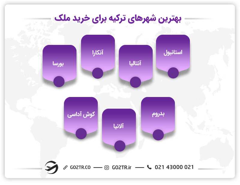 تقاضای خارجیها برای خرید ملک در ترکیه طی ۲ سال گذشته به طور قابل توجهی افزایش یافته است و دلایل متعددی برای آن وجود دارد. کاهش قیمت ملک به دلیل کاهش ارزش لیر در برابر دلار و اعطای اقامت و پاسپورت ترکیه تنها از طریق خرید ملکی به ارزش چهارصد هزار دلار تنها برخی از دلایل خریداران برای سرمایه گذاری در ترکیه و خرید ملک در این کشور است. مکانهای مختلفی برای خرید ملک در ترکیه وجود دارد که افراد با توجه به سلیقه و نیاز خود یکی از این اماکن را انتخاب میکنند. با این وجود، تعدادی از بهترین شهرهای ترکیه برای خرید ملک از نظر خارجیها عبارتاند از: استانبول، آنتالیا، آنکارا، بورسا، بدروم، آلانیا و کوش آداسی