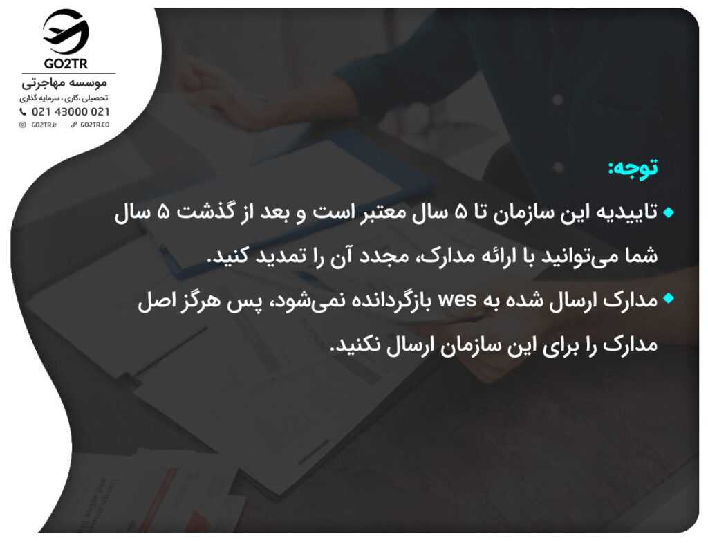 توجه داشته باشید که پس از تایید مدارک، کپی آن برای دانشگاه یا موسسه تحصیلی مورد نظر ارسال میشود. سپس پاسخ کتبی از سوی موسسه WES برای دانشگاه مورد نظر مبنی بر اعتبار داشتن/نداشتن مدارک ارسال خواهد شد.