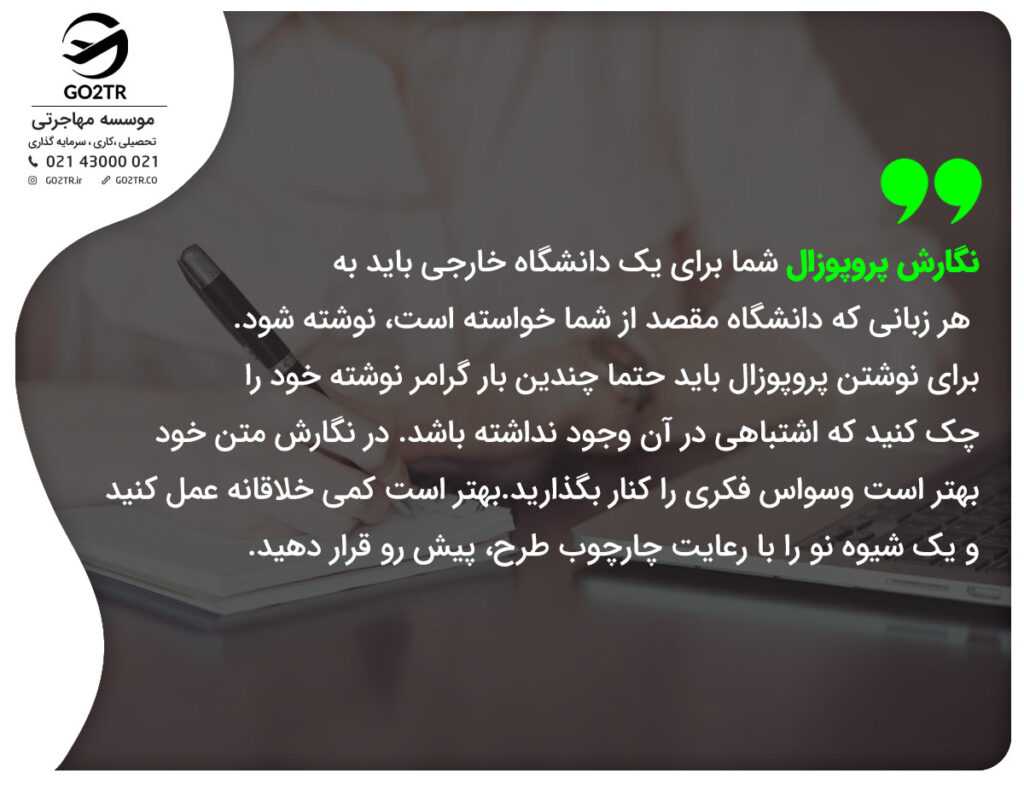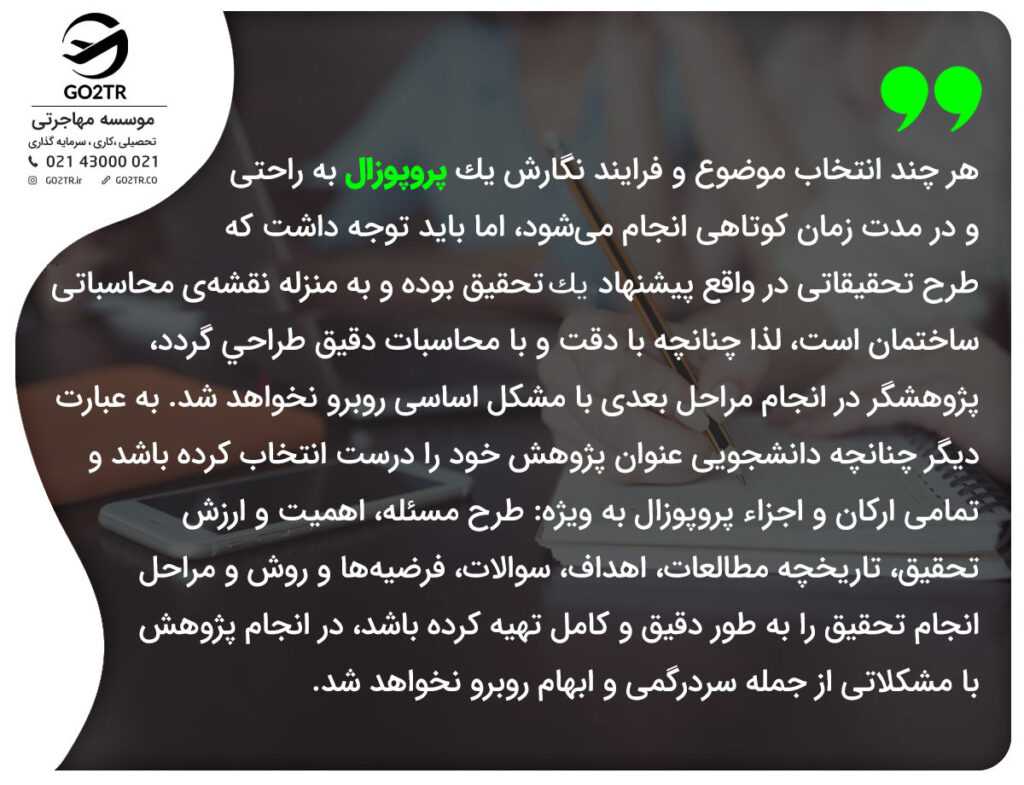 تمام افرادی که برای اپلای دانشگاه در مقطع فوق لیسانس و دکترا اقدام کردهاند با واژهی ریسرچ پروپزال یا طرح تحقیق آشنایی دارند. آیا میدانید ریسرچ پروپزال در فرایند اپلای اهمیت بسیاری دارد؟ آیا میدانید با داشتن یک ریسرچ پروپزال خوب و دقیق شانس شما در پذیرش دانشگاه و گرفتن بورسیه افزایش خواهد یافت؟ اگر شما هم علاقهمند به تحصیل در خارج هستید، موسسه GO2TR به طور کامل در این پروسه شما را یاری خواهد کرد. همچنین مشاوران ما به صورت ۲۴ ساعته در حال خدمترسانی به شما عزیزان خواهند بود. در این مقاله قصد داریم شما را با ریسرچ پروپزال یا طرح تحقیق و اهمیت آن آشنا کنیم. پس تا پایان این مطلب ما را همراهی کنید.