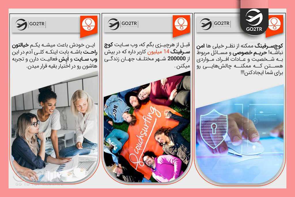 | ترویج دوستی بینالمللی | با استفاده از کوچ سرفینگ شما میتوانید در اقصینقاط جهان دوستان خوب و صمیمی جدید پیدا کنید و دایرهی معاشرت و دوستی خود را افزایش دهید. |