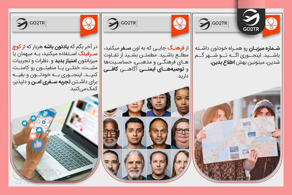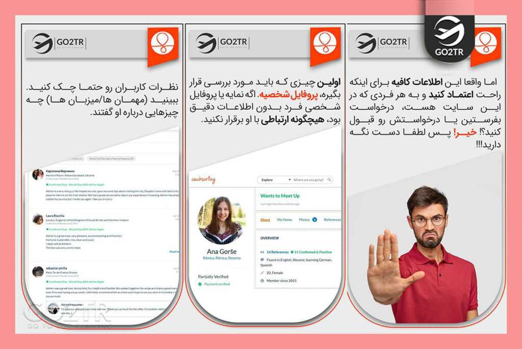 به طور کلی کسانی که برای اولین بار با کوچ سرفینگ آشنا میشوند، نسبت به عدم وجود امنیت کافی نگران هستند. وبسایت اصلی کوچسرفینگ امنیت اخلاقی حدود ۲۰ نفر از اعضای خود را تضمین کرده و آنها افرادی هستند که قطعا با اقامت در خانههایشان با مشکلی مواجه نخواهید شد. اما قبل از هر چیزی سعی کنید پروفایل میزبانان را با دقت مطالعه کنید، عکسهایشان را در فضای مجازی دنبال کنید و حتما و حتما نظرات میهمانان قبلی را بخوانید تا بتوانید با اطمینان بیشتری میزبان خود را انتخاب کنید.