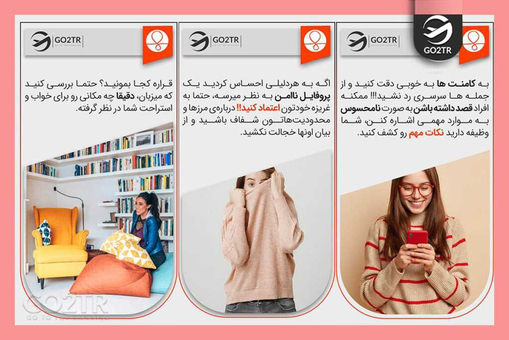 اگر شرایط خاصی برای میزبان خود دارید میتوانید کاملا محترمانه آن را در پروفایل خود ذکر کنید. مثلا این که دوست دارید میزبان، در حد توان، چه کارهایی را برای شما انجام دهد، یا این که از انجام چه کارهایی میخواهید خودداری کند. پروفایل شما به صورت کامل می تواند شما را به دیگران معرفی کند.