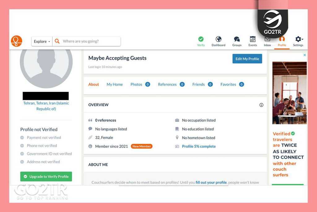 در ابتدا پس از ثبتنام (ثبت نام و نام خانوادگی و ایمیل شخصی)، یک پروفایل برای شما ایجاد خواهد شد، سپس مشخصاتی از قبیل شغل، عکس، علاقمندیها، تجربیات و مختصری در مورد شخصیت خودتان در آن بنویسید. در این وب سایت میتوانید مهمان یا میزبان باشید و شرایط و جزییات را نیز در قسمت درخواست ها بنویسید. در ابتدا اولویتهای خود را مشخص کنید. ازجمله مواردیکه دربارهی خود و شرایط تان است میتوان به موارد زیر اشاره کرد: