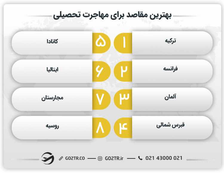 کشورهای فرانسه، ترکیه و روسیه از کشورهای برتر و ارزان برای تحصیل در خارج هستند و کشورهای آلمان و کانادا به دلیل نیاز زیاد به نیروی کار و کشور سوئیس به دلیل درآمد بالا، از بهرین مقاصد مهاجرت کاری هستند.