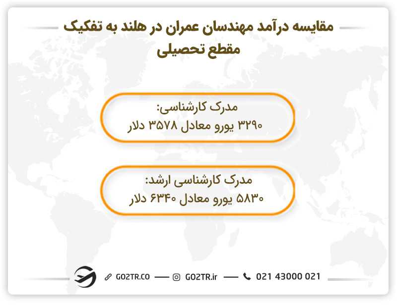 - متوسط درآمد سالانه مهندسی عمران در هلند: ۵۵,۹۰۰ یورو در سال معادل ۶۰,۸۴۰ دلار