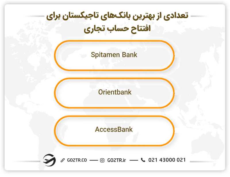 پروسه افتتاح حساب تجاری در تاجیکستان نیز مانند سایر کشورها برای انجام انواع فعالیتهای تجاری در این کشور الزامی است. در این کشور بانکهای مختلفی برای ایجاد حساب تجاری وجود دارد که در جدول زیر به معرفی مناسبترین بانکها برای ایجاد حساب تجاری مناسب هر نوع شرکت در این کشور میپردازیم.