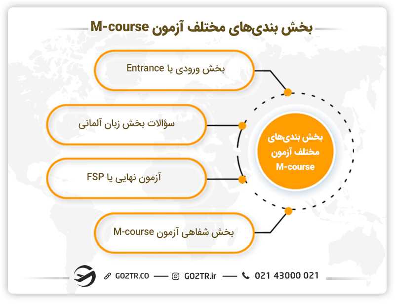 همانطور که متوجه شدید آزمون M-course دارای دو آزمون؛ یکی برای ورود به کالج و دیگری هنگام خروج و اقدام برای پذیرش در دانشگاه مقصد میباشد. در هر دو آزمون، بخشهای مختلفی وجود دارند که زبان آلمانی در هر دو مشترک است.