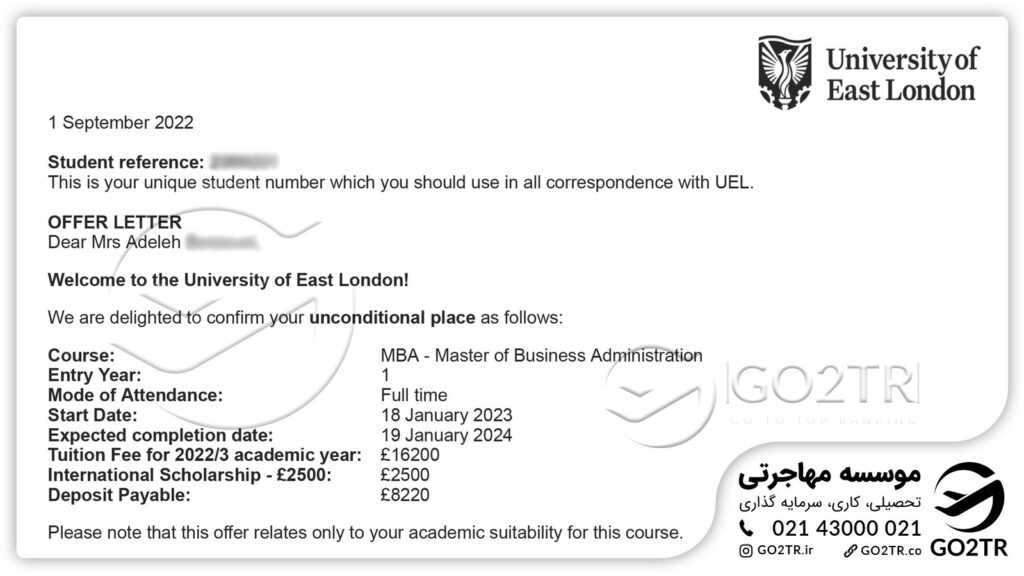 - ارسال درخواست پذیرش برای سه دانشگاه مختلف انگلستان و دریافت پذیرش از یکی از دانشگاهها