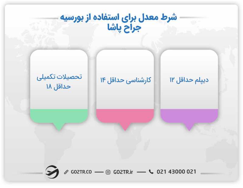 شرط معدل برای استفاده از بورسیه دانشگاه جراح پاشا وجود دارد که از قرار زیر است: برای تحصیل در ترکیه در مقطع دیپلم معدل شما باید حداقل ۱۲ باشد، برای مقطع لیسانس معدل حداقل ۱۴ و برای مقطع تحصیلی تکمیلی نیز معدل حداقل ۱۵ اعلام شده است. در صورتی که قصد شما تحصیل در رشتههای پزشکی باید حداقل معدل مورد پذیرش بورسیه تحصیلی حداقل ۱۸ است. در صورتی که بخواهید برای مقطع کارشناسی در ترکیه از بورسیه تحصیلی استفاده کنید باید تاریخ تولدتان بعد از ۱۲ دی ۱۳۷۶ باشد و برای مقطع فوقلیسانس تاریخ تولد شخص باید پس از ۱۱ دی ۱۳۶۷ باشد و برای بورسیه تحصیلی مقطع دکترا نیز تاریخ تولد شخص متقاضی پس از ۱۱ دی ۱۳۶۲ ارزیابی میشود.