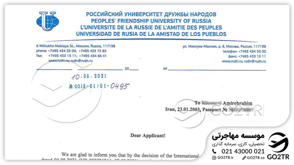 همچنین در ادامه پرونده موفق اخذ پذیرش دانشگاه رودن روسیه توسط کارشناسان متخصص موسسه GO2TR ارائه شده است: