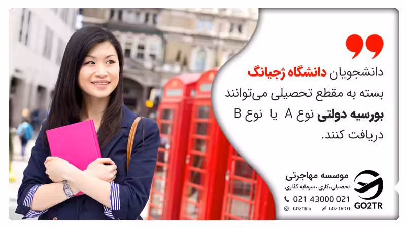 بورسیه دولتی چین یکی از بهترین بورسیهها برای تحصیل در دانشگاه ژجیانگ است. دانشجویان متقاضی تحصیل در مقطع کارشناسی میتوانند برای دریافت بورسیه دولتی نوع A درخواست بدهند. امکان استفاده از بورسیه دولتی نوع A فقط برای دانشجویان متقاضی تحصیل به زبان چینی، امکانپذیر است. دانشجویان متقاضی تحصیل در مقطع کارشناسی ارشد و دکتری میتوانند برای دریافت بورسیه دولتی نوع A و نوع B درخواست بدهند.