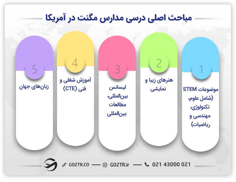 با توجه به انجمن غیر انتفاعی (Magnet Schools of America)، مدارس آهنربایی ممکن است پنج زمینه اصلی تخصص را ارائه دهند که شامل موارد زیر است: