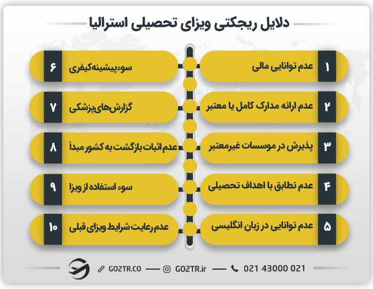 - سوء استفاده از ویزا: اگر مقامات استرالیا متوجه شوند که شما در گذشته از ویزاهای مختلف سوء استفاده کردهاید (مثلاً برای مقاصد غیرتحصیلی)، ممکن است ویزای شما رد شود.