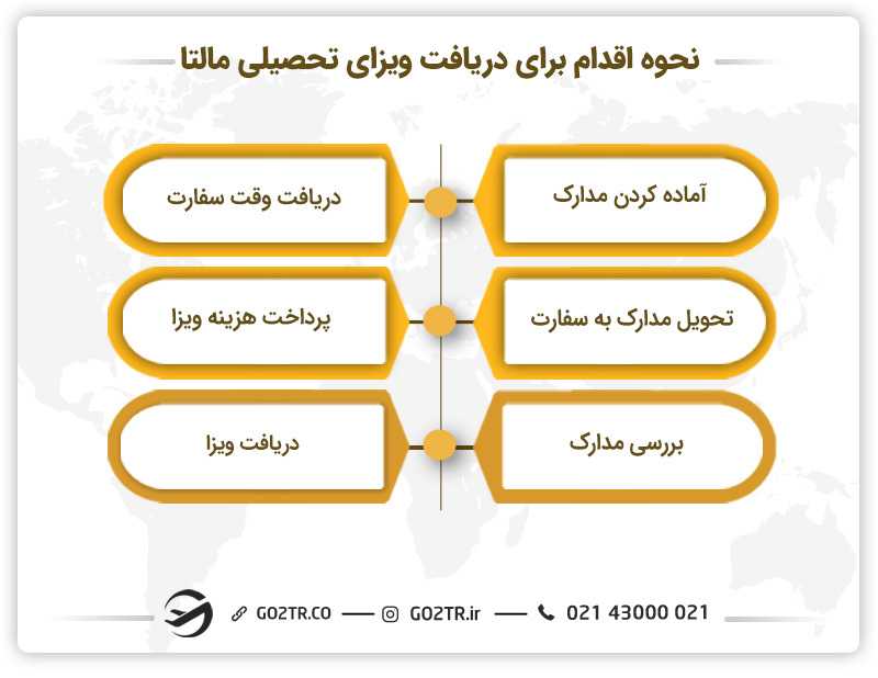 با توجه به اینکه سالانه ۱۵ درصد از درخواستهای ویزای تحصیلی مالتا توسط سفارت ریجکت خواهد شد، جهت ثبت درخواست صحیح برای ویزای تحصیلی خود با کارشناسان موسسه مهاجرتی GO2TR به رایگان تماس بگیرید.