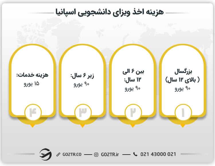 هزینه اخذ ویزای دانشجویی اسپانیا برای اتباع غیراروپایی معمولاً حدود ۹۰ یورو است. این مبلغ میتواند بسته به کشور مبدا و سفارت یا کنسولگری اسپانیا کمی متفاوت باشد. هزینه ویزای دانشجویی برای افرادی که قصد تحصیل در اسپانیا را دارند، غیرقابل بازگشت است.