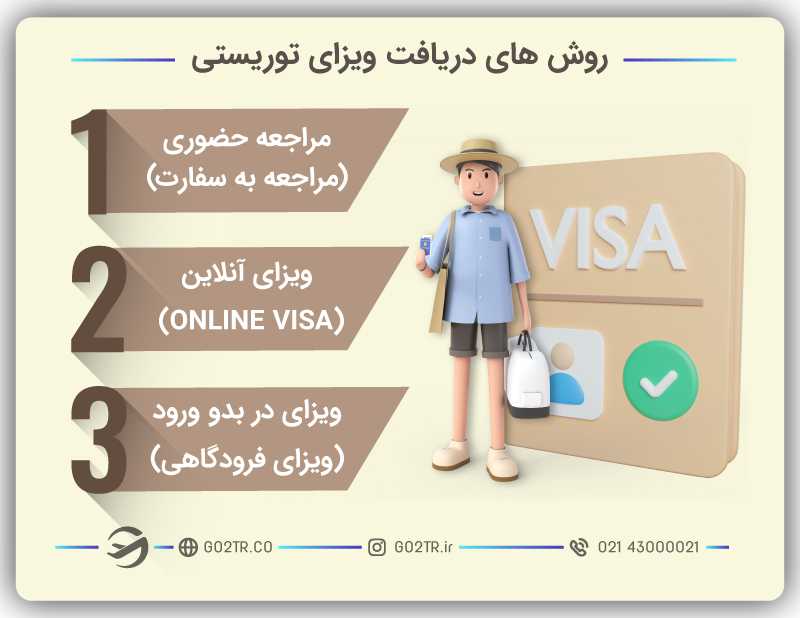این نوع ویزا کاربردها و انواع گوناگونی دارد که افراد بر اساس شرایط و دلایل خود مانند گردشگری، بازدید از اقوام، شرکت در کنگره یا همایش، درمانی یا تجاری برای سفر اقدام به اخذ ویزای توریستی مینمایند. ویزاهای توریستی از نوع ویزای کوتاه مدت (موقت) محسوب میشوند و بهصورت یکبار ورود یا سینگل صادر میگردند. برای اخذ ویزای توریستی سه روش وجود دارد.